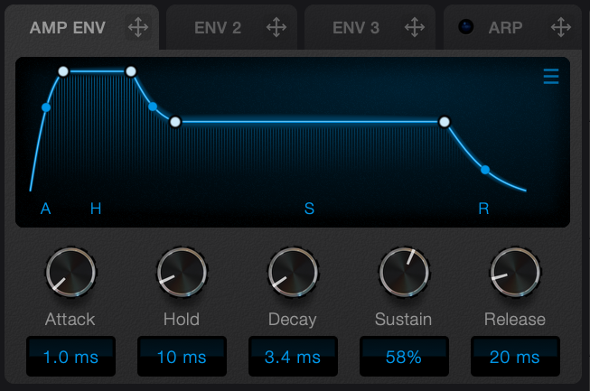 The amount of time it takes for the envelope to reach it's full level. You can set the attack to zero, which means that the sound will start at the max level. Take care when doing this because if the Osc has a waveform that doesn't start at zero, you can hear clicks. A value of 5 milliseconds can fix this. - Hold
