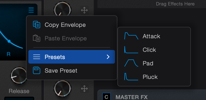 The amount of time it takes to fade to silence after the MIDI note has been released. - You can modulate any of the Envelope parameters from other sources.