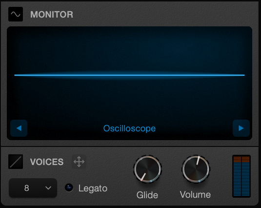 The bottom right of the synth contains a monitor and output section for controlling the volume and voicing options in your patch.
